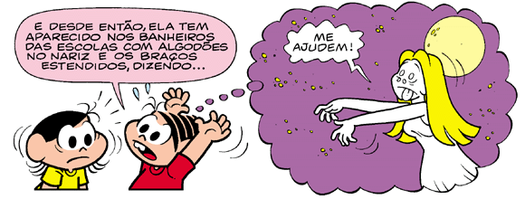 Até a turma do Limoeiro tem medo da Loira do Banheiro (via) Uma lenda urbana com um fundinho de lição de moral. Você com certeza já ouviu a história da loira do banheiro. Reza a lenda que uma jovem e bela menina matava aulas no banheiro da escola e seu castigo foi mais do que pegar recuperação. As versões sobre a sua morte divergem: alguns dizem que a pobre garota escorregou e bateu a cabeça, outros afirmam que ela teria se suicidado ou, até mesmo, sido assassinada. Inconformada com a morte prematura, ela passou a assombrar os banheiros da escola, e não faltam relatos de estudantes que juram ter visto uma versão brasileira da Murta que Geme perambulando entre as privadas. Nada de matar aula no banheiro, crianças. 5. Homem do saco